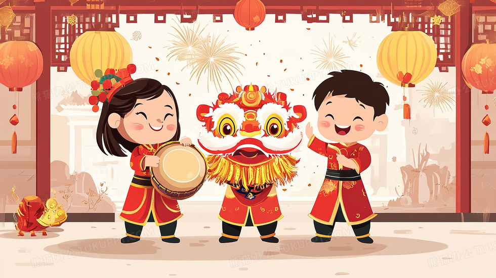 本作品内容为孩子舞狮迎新春新年喜庆插画, 格式为 jpg, 大小3 MB, 图片尺寸为2912 x 1632, 源文件无水印, 欢迎使用熊猫办公。 如认为平台内容涉嫌侵权,可通过邮件:tousu@tukuppt.com提出书面通知,我们将及时处理。