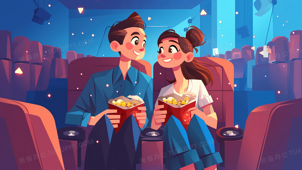 本作品内容为电影院吃爆米花看电影的情侣插画, 格式为 jpg, 大小2 MB, 图片尺寸为2912 x 1632, 源文件无水印, 欢迎使用熊猫办公。 如认为平台内容涉嫌侵权,可通过邮件:tousu@tukuppt.com提出书面通知,我们将及时处理。