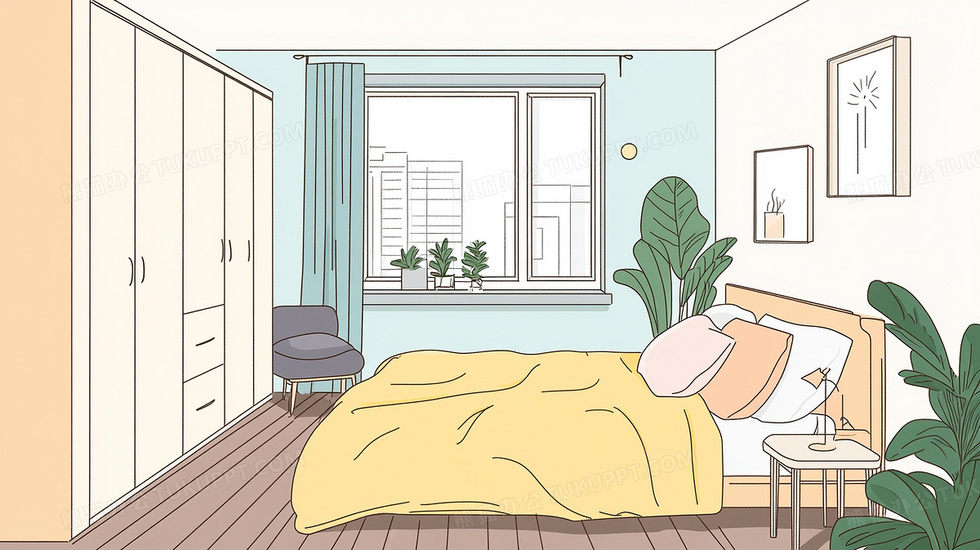 本作品内容为手绘风卧室场景插画, 格式为 jpg, 大小2 MB, 图片尺寸为2912 x 1632, 源文件无水印, 欢迎使用熊猫办公。 如认为平台内容涉嫌侵权,可通过邮件:tousu@tukuppt.com提出书面通知,我们将及时处理。