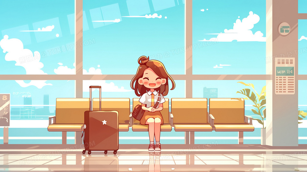 本作品内容为飞机场拿行李箱候机的Q版女孩插画, 格式为 jpg, 大小2 MB, 图片尺寸为2912 x 1632, 源文件无水印, 欢迎使用熊猫办公。 如认为平台内容涉嫌侵权,可通过邮件:tousu@tukuppt.com提出书面通知,我们将及时处理。