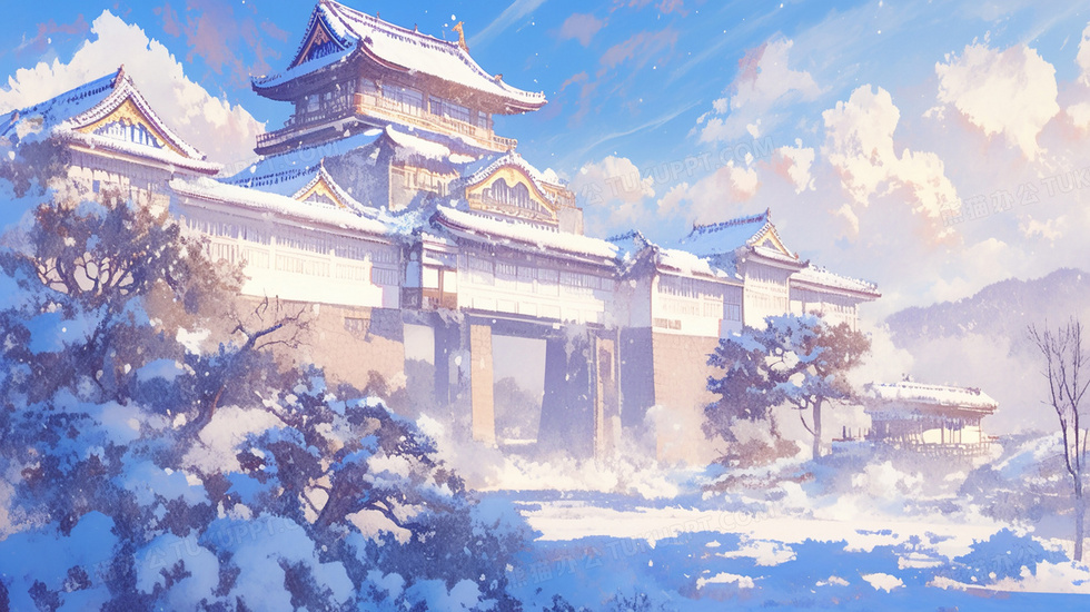 本作品内容为蓝天白云积雪古城建筑唯美景色插画, 格式为 jpg, 大小3 MB, 图片尺寸为2912 x 1632, 源文件无水印, 欢迎使用熊猫办公。 如认为平台内容涉嫌侵权,可通过邮件:tousu@tukuppt.com提出书面通知,我们将及时处理。