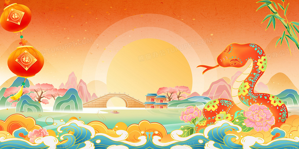 本作品内容为中国风国潮新年2025蛇年新年吉祥物背景, 格式为 psd, 大小58 MB, 图片尺寸为4724 x 2362, 作品中背景图片无需修改, 源文件无水印,可以直接使用, 欢迎使用熊猫办公。 如认为平台内容涉嫌侵权,可通过邮件:tousu@tukuppt.com提出书面通知,我们将及时处理。