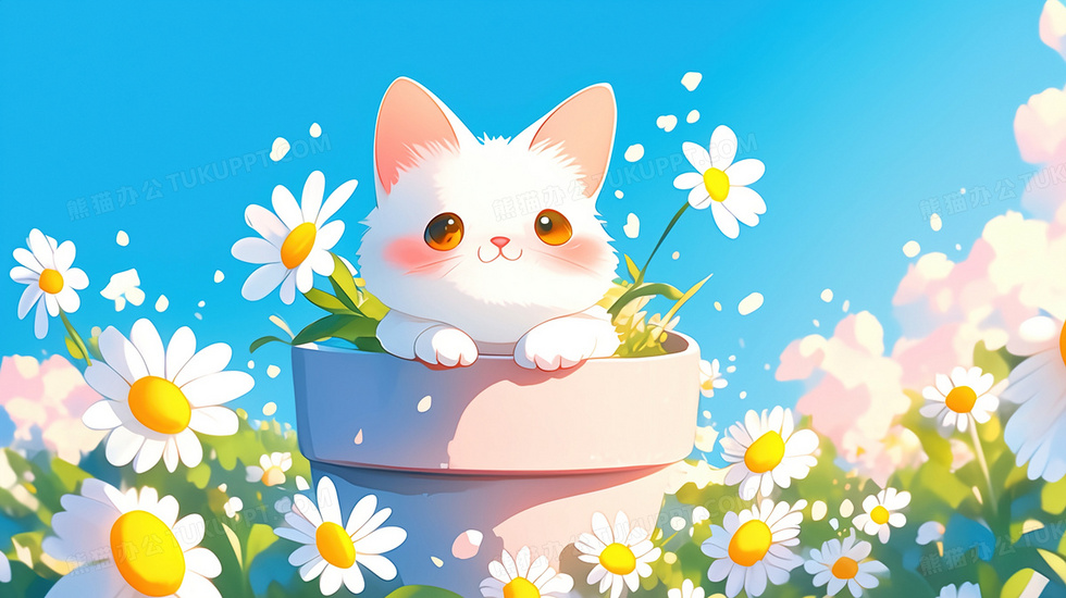 本作品内容为蓝色白云小雏菊盆栽可爱宠物猫插画, 格式为 jpg, 大小2 MB, 图片尺寸为2912 x 1632, 源文件无水印, 欢迎使用熊猫办公。 如认为平台内容涉嫌侵权,可通过邮件:tousu@tukuppt.com提出书面通知,我们将及时处理。