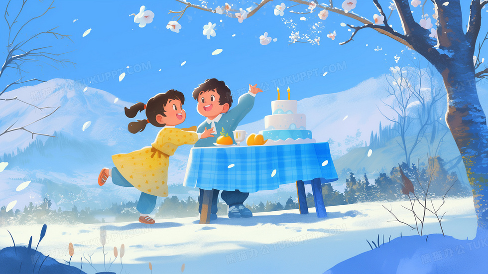 本作品内容为两个孩子围着桌子上的蛋糕庆祝生日插画, 格式为 jpg, 大小6 MB, 图片尺寸为2912 x 1632, 源文件无水印, 欢迎使用熊猫办公。 如认为平台内容涉嫌侵权,可通过邮件:tousu@tukuppt.com提出书面通知,我们将及时处理。