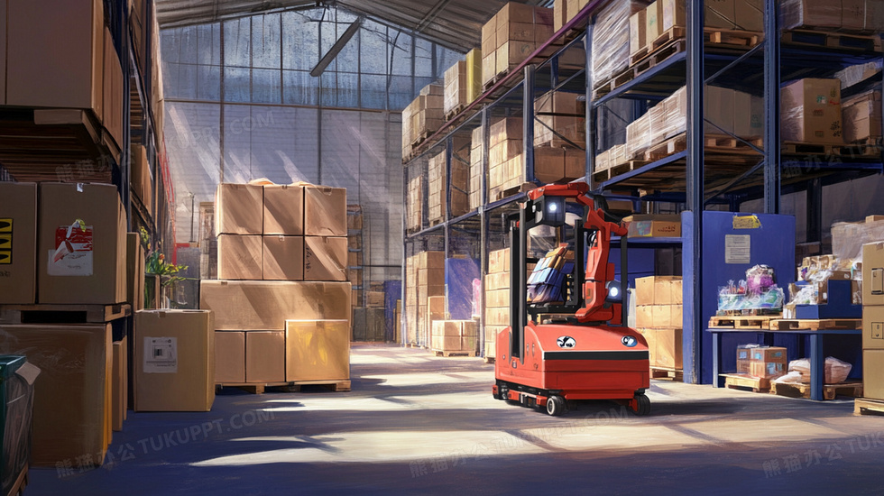 本作品内容为仓库内机器人搬运货物插画, 格式为 jpg, 大小2 MB, 图片尺寸为1456 x 816, 源文件无水印, 欢迎使用熊猫办公。 如认为平台内容涉嫌侵权,可通过邮件:tousu@tukuppt.com提出书面通知,我们将及时处理。