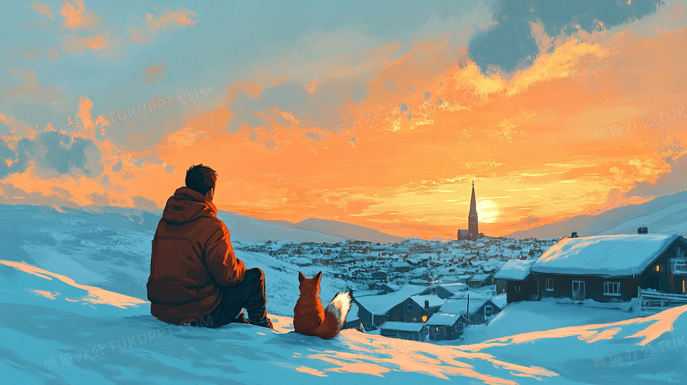 本作品内容为冬天雪地山上看日出的人物背影插画, 格式为 jpg, 大小3 MB, 图片尺寸为2912 x 1632, 源文件无水印, 欢迎使用熊猫办公。 如认为平台内容涉嫌侵权,可通过邮件:tousu@tukuppt.com提出书面通知,我们将及时处理。