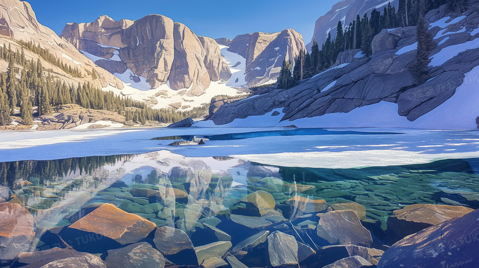 本作品内容为蓝天白云湖面凝固冰川雪山景色插画, 格式为 jpg, 大小4 MB, 图片尺寸为2912 x 1632, 源文件无水印, 欢迎使用熊猫办公。 如认为平台内容涉嫌侵权,可通过邮件:tousu@tukuppt.com提出书面通知,我们将及时处理。