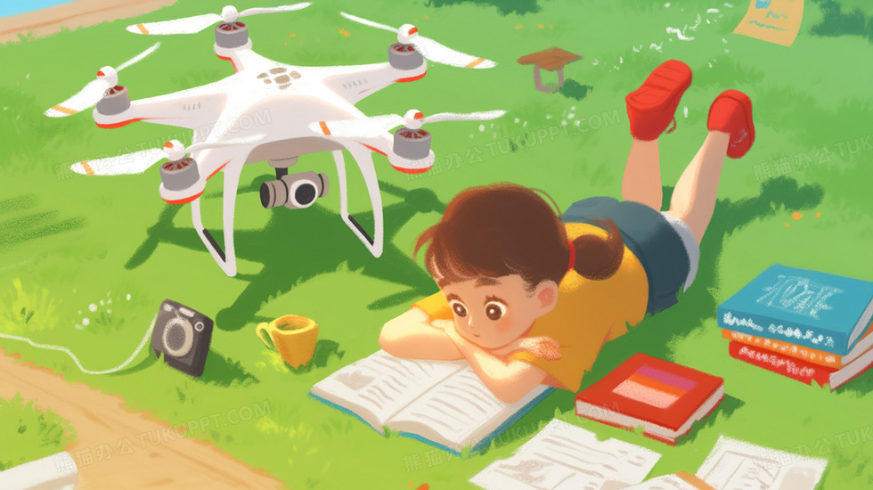 本作品内容为卡通女孩趴在草地看书无人机插画, 格式为 jpg, 大小2 MB, 图片尺寸为2912 x 1632, 源文件无水印, 欢迎使用熊猫办公。 如认为平台内容涉嫌侵权,可通过邮件:tousu@tukuppt.com提出书面通知,我们将及时处理。