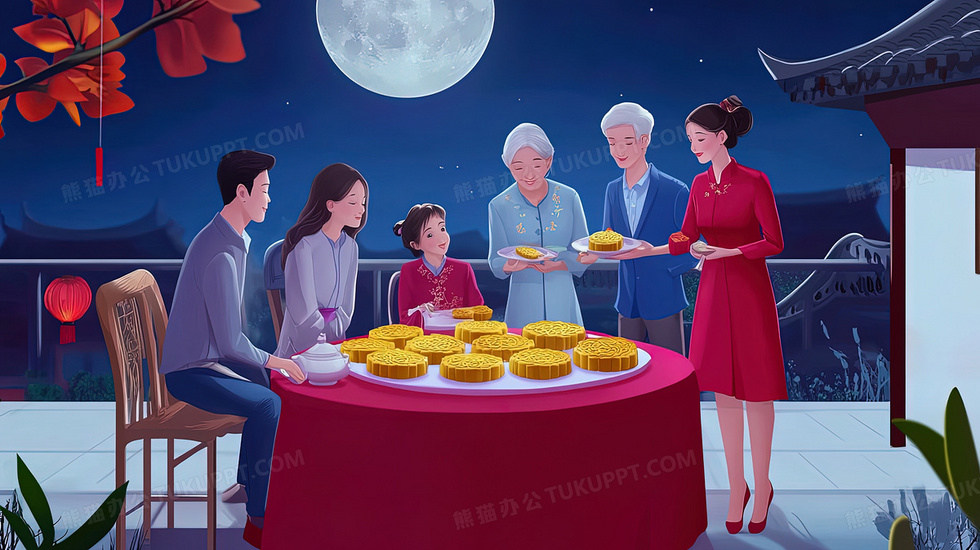 本作品内容为中秋圆月下吃月饼的一家人插画, 格式为 jpg, 大小3 MB, 图片尺寸为2912 x 1632, 源文件无水印, 欢迎使用熊猫办公。 如认为平台内容涉嫌侵权,可通过邮件:tousu@tukuppt.com提出书面通知,我们将及时处理。