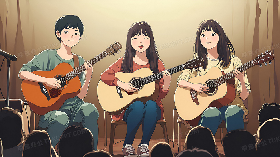 本作品内容为三个年轻人抱着吉他唱歌插画, 格式为 jpg, 大小1 MB, 图片尺寸为2912 x 1632, 源文件无水印, 欢迎使用熊猫办公。 如认为平台内容涉嫌侵权,可通过邮件:tousu@tukuppt.com提出书面通知,我们将及时处理。