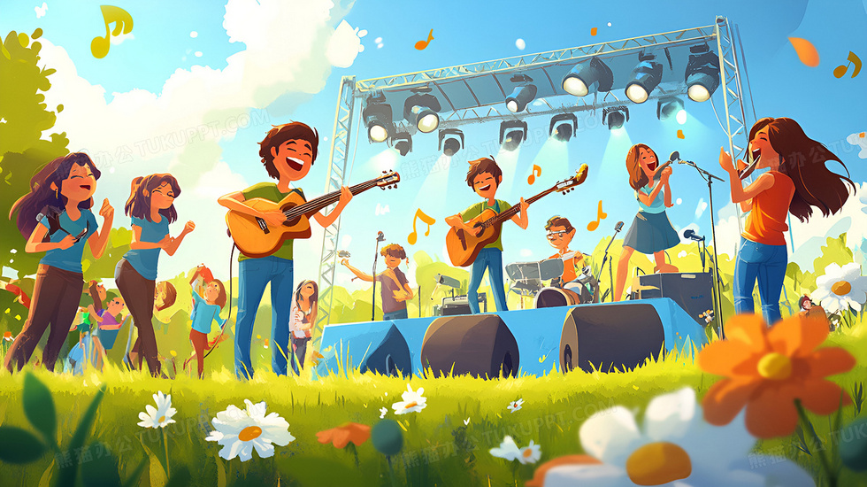本作品内容为一群年轻人在户外草坪搭建舞台唱歌插画, 格式为 jpg, 大小2 MB, 图片尺寸为2912 x 1632, 源文件无水印, 欢迎使用熊猫办公。 如认为平台内容涉嫌侵权,可通过邮件:tousu@tukuppt.com提出书面通知,我们将及时处理。