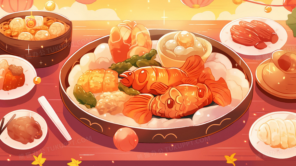 本作品内容为快乐节日丰盛美味的菜肴插画, 格式为 jpg, 大小6 MB, 图片尺寸为2912 x 1632, 源文件无水印, 欢迎使用熊猫办公。 如认为平台内容涉嫌侵权,可通过邮件:tousu@tukuppt.com提出书面通知,我们将及时处理。