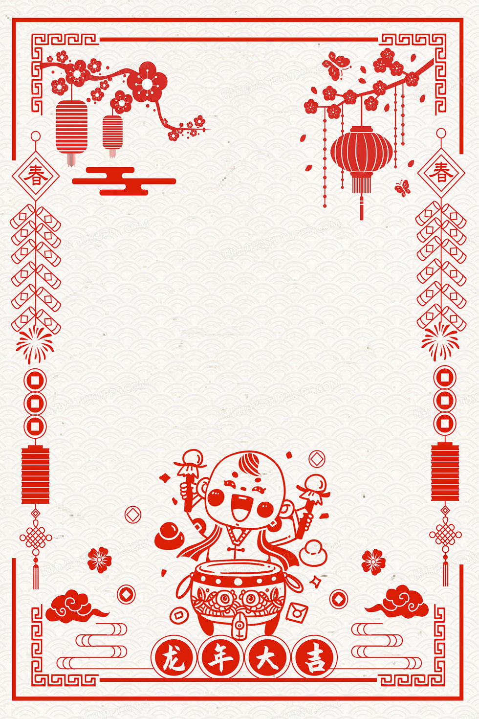 本作品内容为新年2024年龙年剪纸风龙年大吉敲锣打鼓梅花边框背景, 格式为 ai, 大小11 MB, 图片尺寸为3543 x 5314, 作品中背景图片无需修改, 源文件无水印,可以直接使用, 欢迎使用熊猫办公。 如认为平台内容涉嫌侵权,可通过邮件:tousu@tukuppt.com提出书面通知,我们将及时处理。