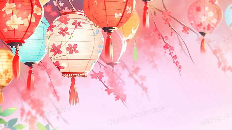 本作品内容为中国新年鲜花彩灯灯笼装饰插画, 格式为 jpg, 大小2 MB, 图片尺寸为1456 x 816, 源文件无水印, 欢迎使用熊猫办公。 如认为平台内容涉嫌侵权,可通过邮件:tousu@tukuppt.com提出书面通知,我们将及时处理。