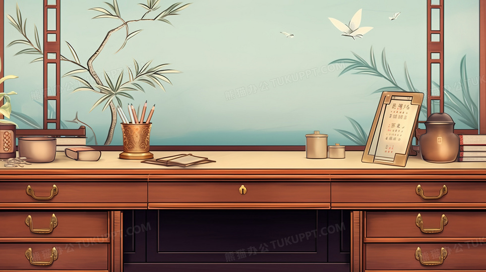 本作品内容为商务古典中国风传统书桌插画, 格式为 jpg, 大小4 MB, 图片尺寸为2912 x 1632, 源文件无水印, 欢迎使用熊猫办公。 如认为平台内容涉嫌侵权,可通过邮件:tousu@tukuppt.com提出书面通知,我们将及时处理。