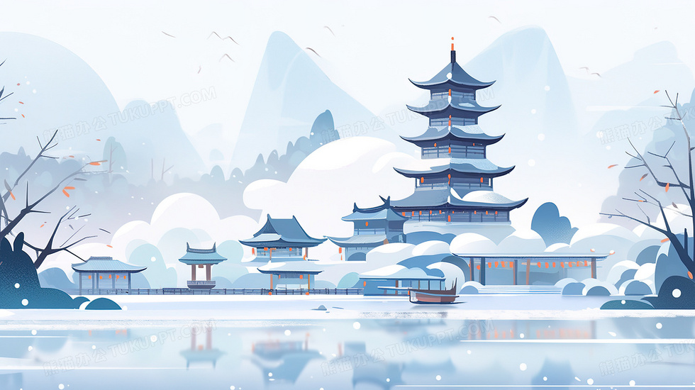本作品内容为冬季大雪湖边的塔楼插画, 格式为 jpg, 大小5 MB, 图片尺寸为2912 x 1632, 源文件无水印, 欢迎使用熊猫办公。 如认为平台内容涉嫌侵权,可通过邮件:tousu@tukuppt.com提出书面通知,我们将及时处理。