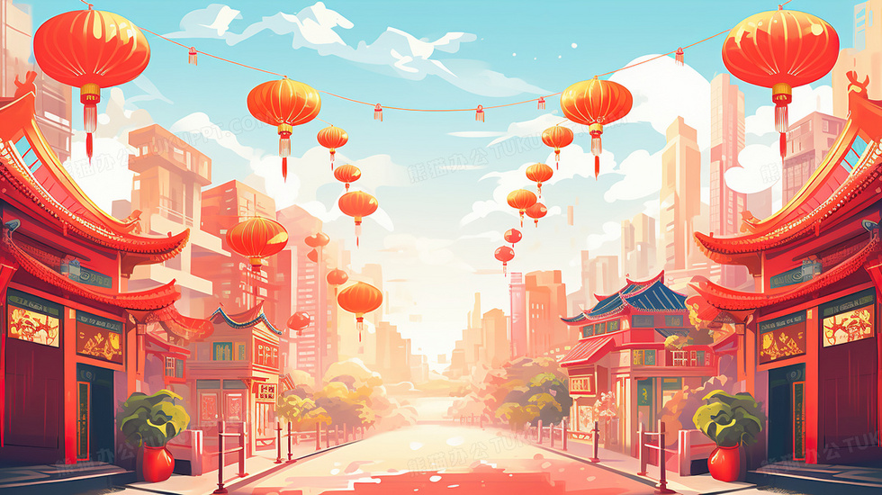 本作品内容为2024新年龙年喜庆街道插画, 格式为 jpg, 大小6 MB, 图片尺寸为2912 x 1632, 源文件无水印, 欢迎使用熊猫办公。 如认为平台内容涉嫌侵权,可通过邮件:tousu@tukuppt.com提出书面通知,我们将及时处理。