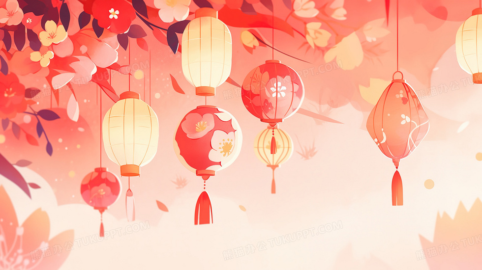 本作品内容为春节鲜花彩灯灯笼装饰插画, 格式为 jpg, 大小4 MB, 图片尺寸为2912 x 1632, 源文件无水印, 欢迎使用熊猫办公。 如认为平台内容涉嫌侵权,可通过邮件:tousu@tukuppt.com提出书面通知,我们将及时处理。