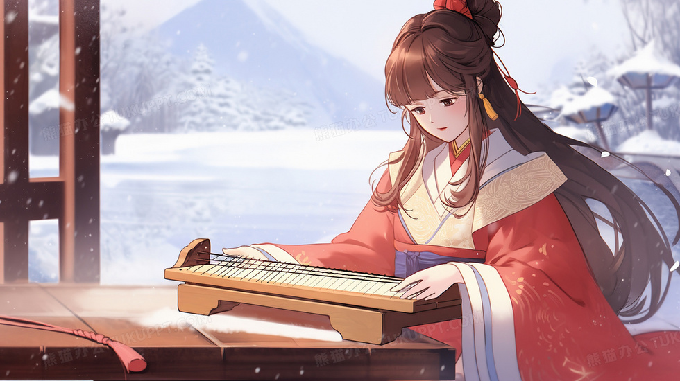 本作品内容为冬天下雪湖边古风女子在弹琴插画, 格式为 jpg, 大小2 MB, 图片尺寸为2912 x 1632, 源文件无水印, 欢迎使用熊猫办公。 如认为平台内容涉嫌侵权,可通过邮件:tousu@tukuppt.com提出书面通知,我们将及时处理。
