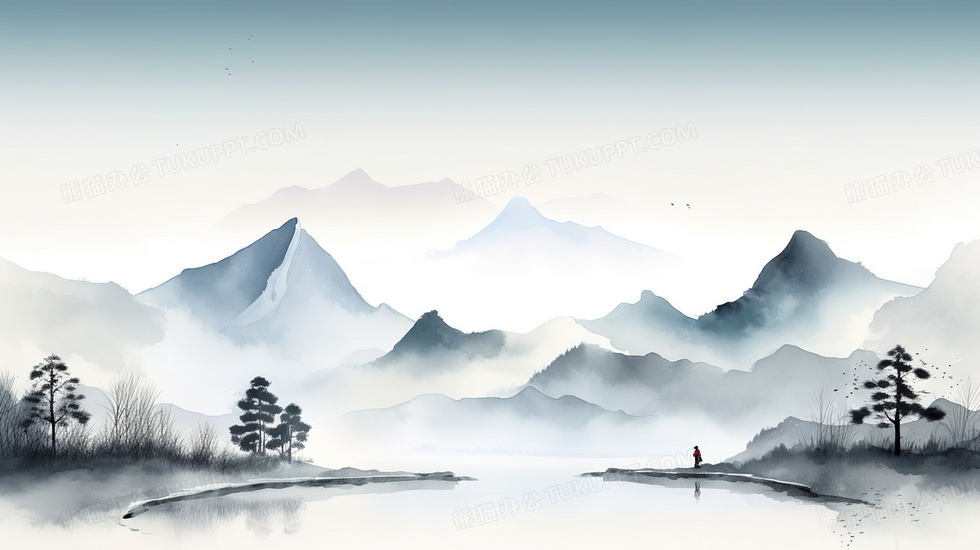 本作品内容为中国风水墨晕染意境山水风景插画, 格式为 jpg, 大小5 MB, 图片尺寸为2912 x 1632, 源文件无水印, 欢迎使用熊猫办公。 如认为平台内容涉嫌侵权,可通过邮件:tousu@tukuppt.com提出书面通知,我们将及时处理。