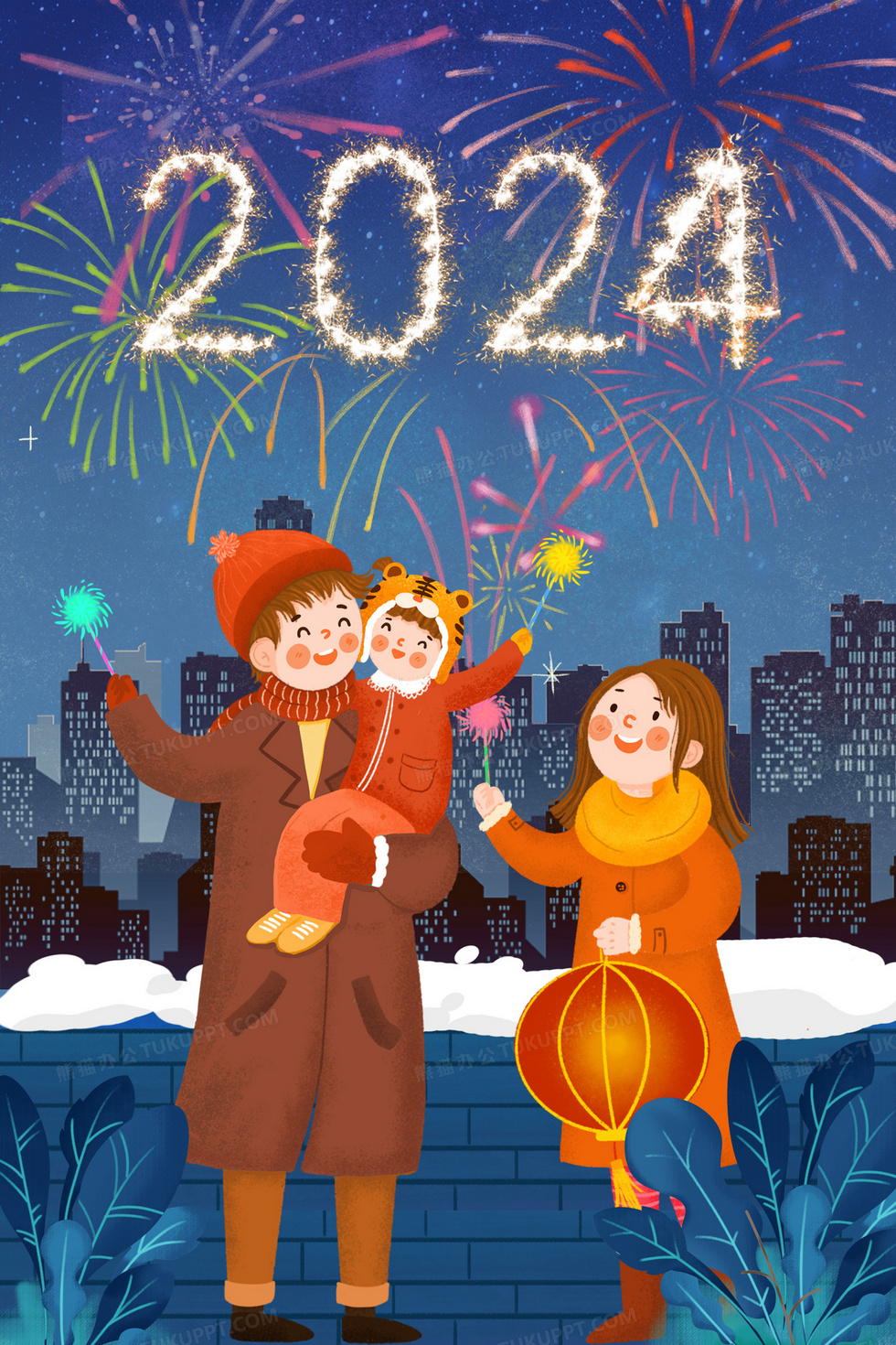 本作品内容为深蓝色卡通一家三口过小年元旦2024烟火创意字插画, 格式为 psd, 大小55 MB, 请使用软件PhotoShop(CS4)打开, 源文件无水印, 欢迎使用熊猫办公。 如认为平台内容涉嫌侵权,可通过邮件:tousu@tukuppt.com提出书面通知,我们将及时处理。