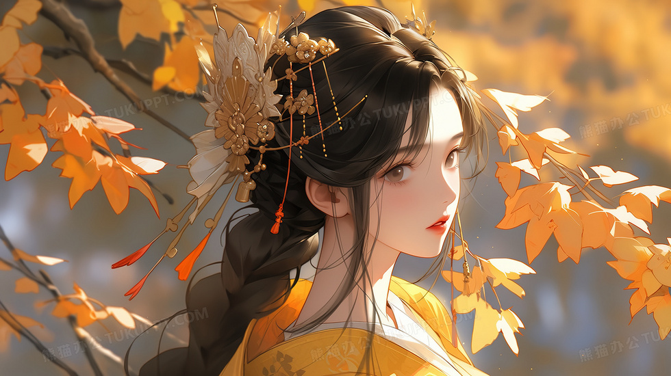 本作品内容为唯美古风美女金色枫树林中的少女创意插画, 格式为 jpg, 大小6 MB, 图片尺寸为2912 x 1632, 源文件无水印, 欢迎使用熊猫办公。 如认为平台内容涉嫌侵权,可通过邮件:tousu@tukuppt.com提出书面通知,我们将及时处理。