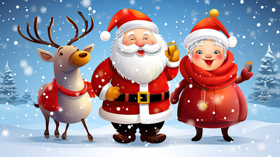 本作品内容为圣诞节卡通圣诞老人和麋鹿插画, 格式为 jpg, 大小6 MB, 图片尺寸为2912 x 1632, 源文件无水印, 欢迎使用熊猫办公。 如认为平台内容涉嫌侵权,可通过邮件:tousu@tukuppt.com提出书面通知,我们将及时处理。