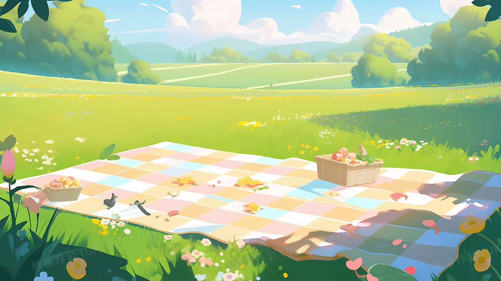 本作品内容为春天唯美蓝天白云野餐美食草地插画, 格式为 jpg, 大小3 MB, 图片尺寸为2912 x 1632, 源文件无水印, 欢迎使用熊猫办公。 如认为平台内容涉嫌侵权,可通过邮件:tousu@tukuppt.com提出书面通知,我们将及时处理。