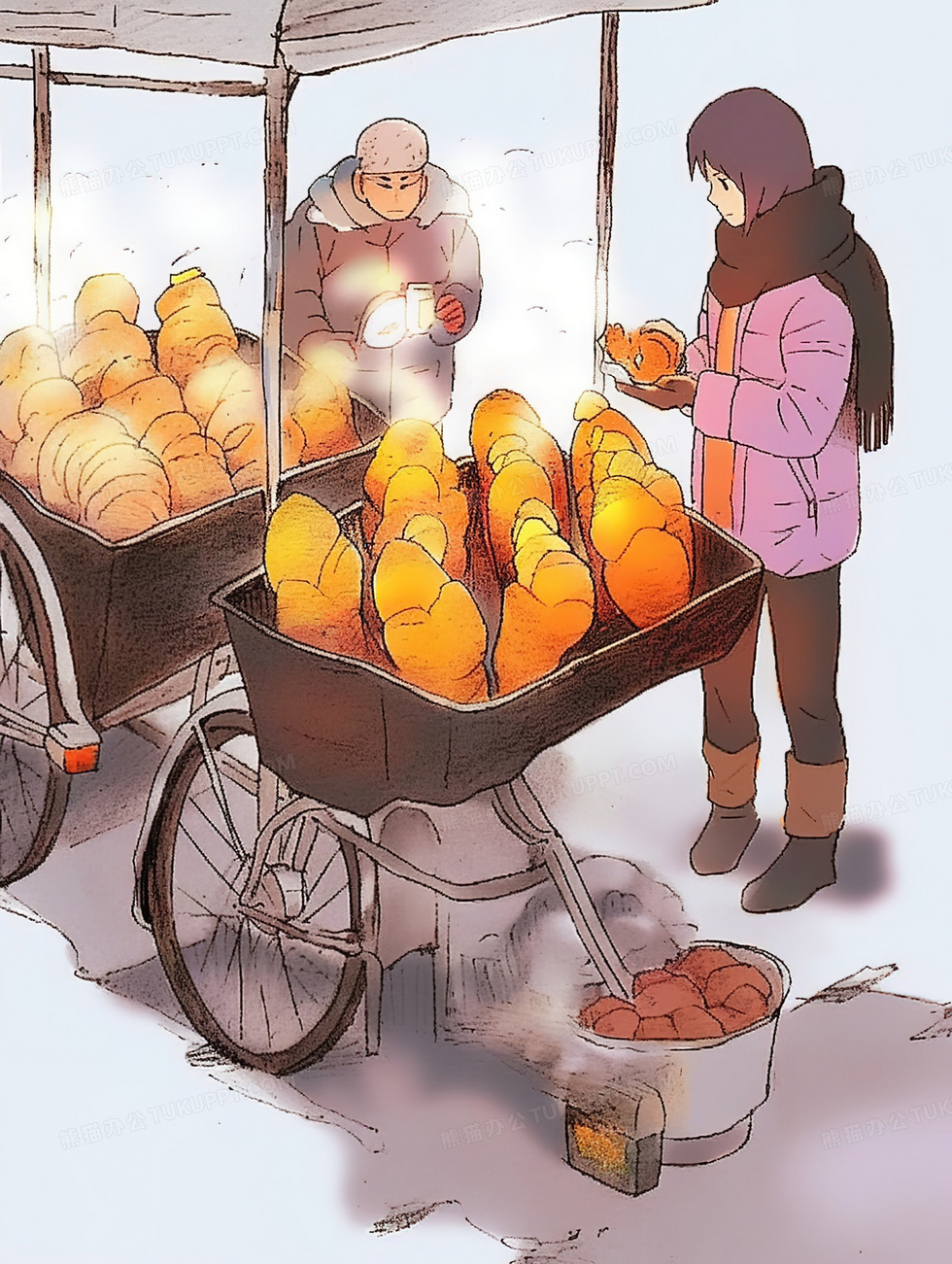 本作品内容为冬日里热气腾腾的小吃摊插画, 格式为 jpg, 大小3 MB, 图片尺寸为1856 x 2464, 源文件无水印, 欢迎使用熊猫办公。 如认为平台内容涉嫌侵权,可通过邮件:tousu@tukuppt.com提出书面通知,我们将及时处理。