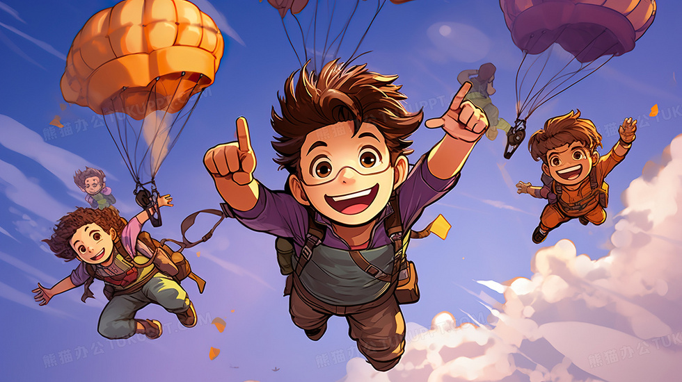 本作品内容为卡通蓝天白云跳伞场景插画, 格式为 jpg, 大小3 MB, 图片尺寸为2912 x 1632, 源文件无水印, 欢迎使用熊猫办公。 如认为平台内容涉嫌侵权,可通过邮件:tousu@tukuppt.com提出书面通知,我们将及时处理。