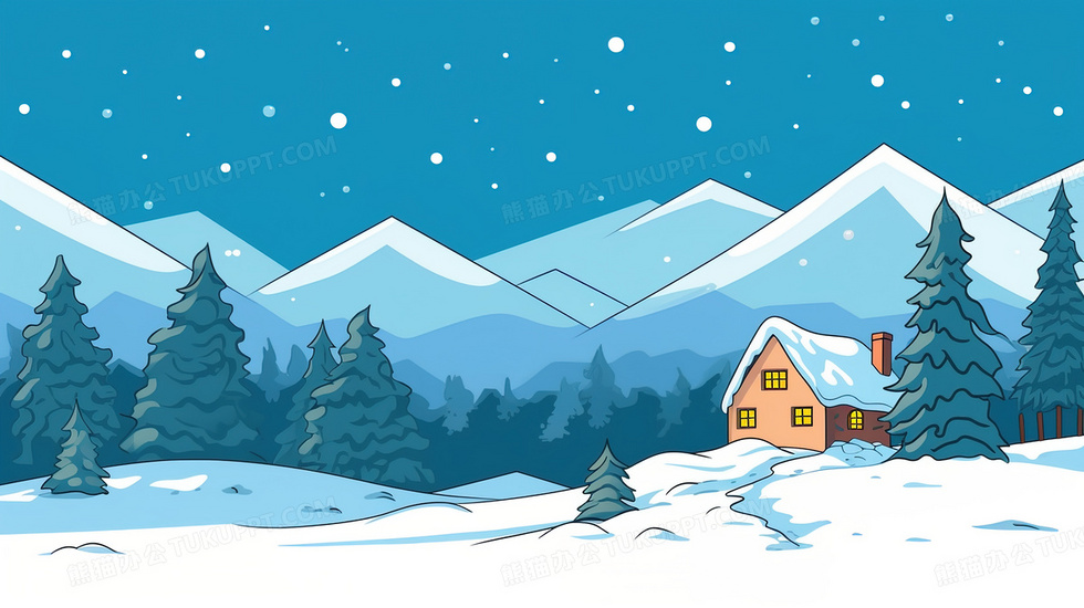 本作品内容为冬天雪中山林里的小木屋插画, 格式为 jpg, 大小4 MB, 图片尺寸为2912 x 1632, 源文件无水印, 欢迎使用熊猫办公。 如认为平台内容涉嫌侵权,可通过邮件:tousu@tukuppt.com提出书面通知,我们将及时处理。