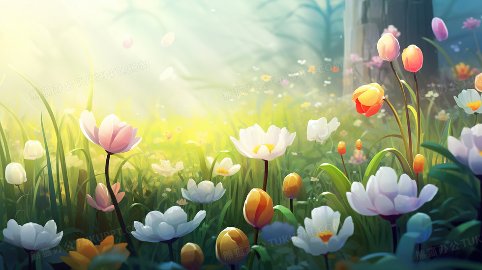 本作品内容为春天绿色草地上绽放的花海唯美清新插画, 格式为 jpg, 大小4 MB, 图片尺寸为2912 x 1632, 源文件无水印, 欢迎使用熊猫办公。 如认为平台内容涉嫌侵权,可通过邮件:tousu@tukuppt.com提出书面通知,我们将及时处理。