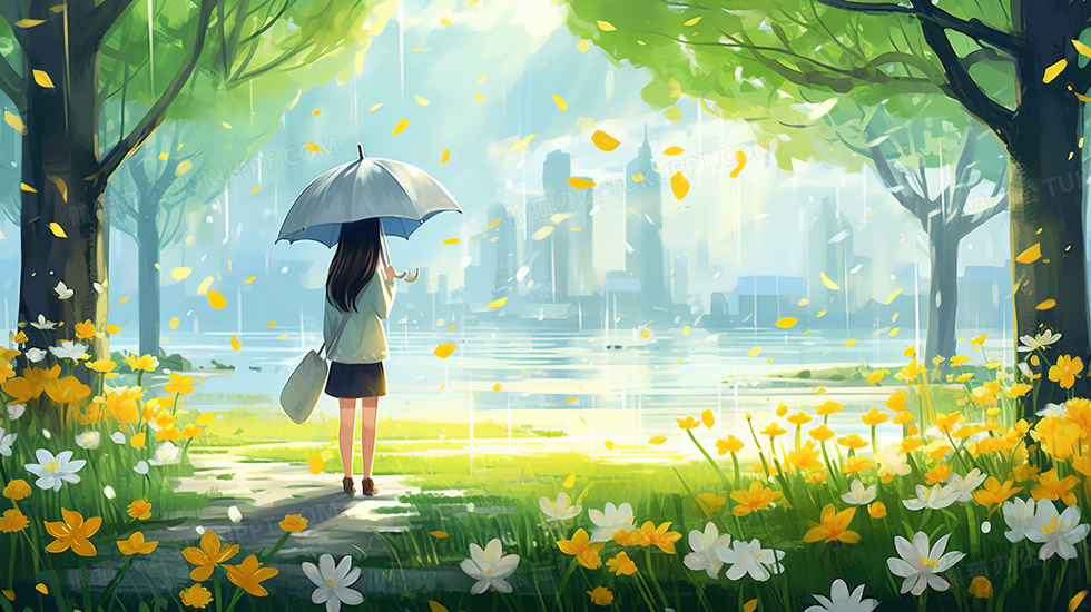 下雨天绿色草地上撑伞的女孩风景唯美插画