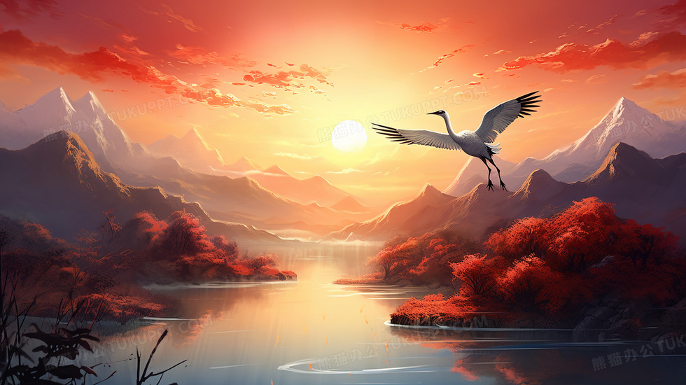 本作品内容为夕阳下飞翔的白鹤中国风山水风景插画, 格式为 jpg, 大小5 MB, 图片尺寸为2912 x 1632, 源文件无水印, 欢迎使用熊猫办公。 如认为平台内容涉嫌侵权,可通过邮件:tousu@tukuppt.com提出书面通知,我们将及时处理。
