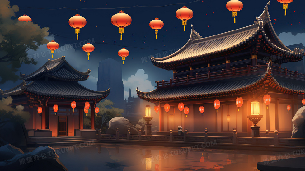 本作品内容为古色古香中秋节挂满红色灯笼的中式庭院创意插画, 格式为 jpg, 大小5 MB, 图片尺寸为2912 x 1632, 源文件无水印, 欢迎使用熊猫办公。 如认为平台内容涉嫌侵权,可通过邮件:tousu@tukuppt.com提出书面通知,我们将及时处理。