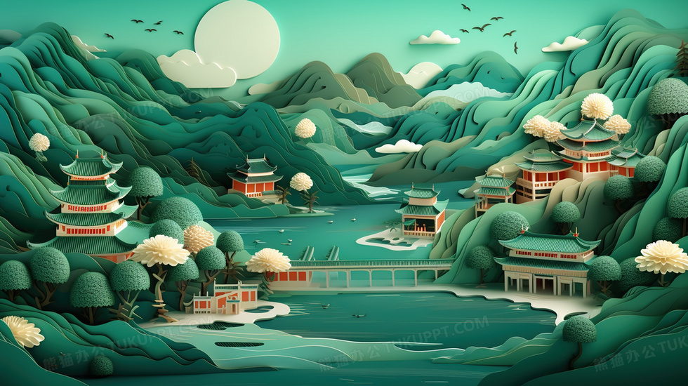 本作品内容为绿色剪纸风古建筑山水风景画, 格式为 jpg, 大小6 MB, 图片尺寸为2912 x 1632, 源文件无水印, 欢迎使用熊猫办公。 如认为平台内容涉嫌侵权,可通过邮件:tousu@tukuppt.com提出书面通知,我们将及时处理。