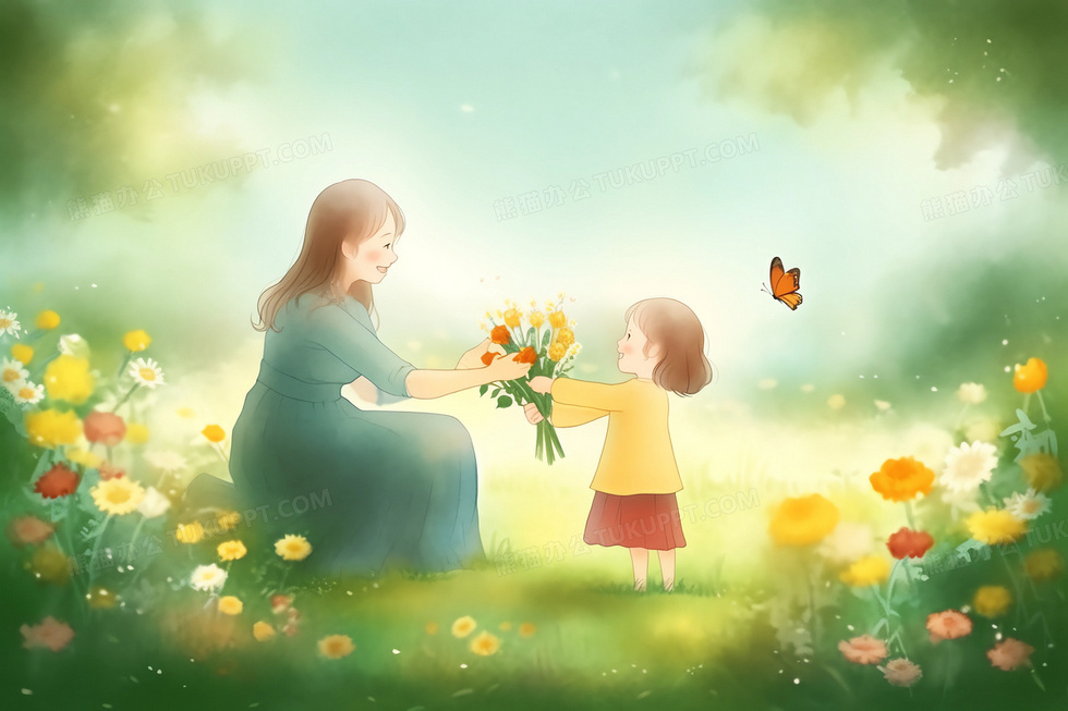 本作品内容为卡通风梦幻花园女孩给妈妈送花插图, 格式为 jpg, 大小3 MB, 图片尺寸为2688 x 1792, 源文件无水印, 欢迎使用熊猫办公。 如认为平台内容涉嫌侵权,可通过邮件:tousu@tukuppt.com提出书面通知,我们将及时处理。