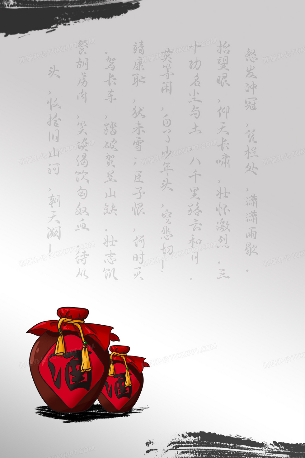 本作品内容为古文水墨酒坛竖版背景, 格式为 psd, 大小42 MB, 图片尺寸为3543 x 5314, 作品中背景图片无需修改, 源文件无水印,可以直接使用, 欢迎使用熊猫办公。 如认为平台内容涉嫌侵权,可通过邮件:tousu@tukuppt.com提出书面通知,我们将及时处理。