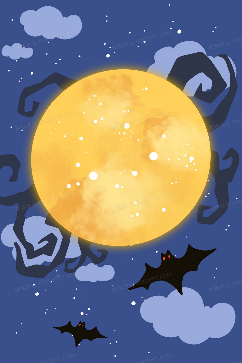 本作品内容为蓝色卡通夜晚万圣节月亮手绘插画背景素材, 格式为 psd, 大小10 MB, 图片尺寸为3543 x 5315, 作品中背景图片无需修改, 源文件无水印,可以直接使用, 欢迎使用熊猫办公。 如认为平台内容涉嫌侵权,可通过邮件:tousu@tukuppt.com提出书面通知,我们将及时处理。