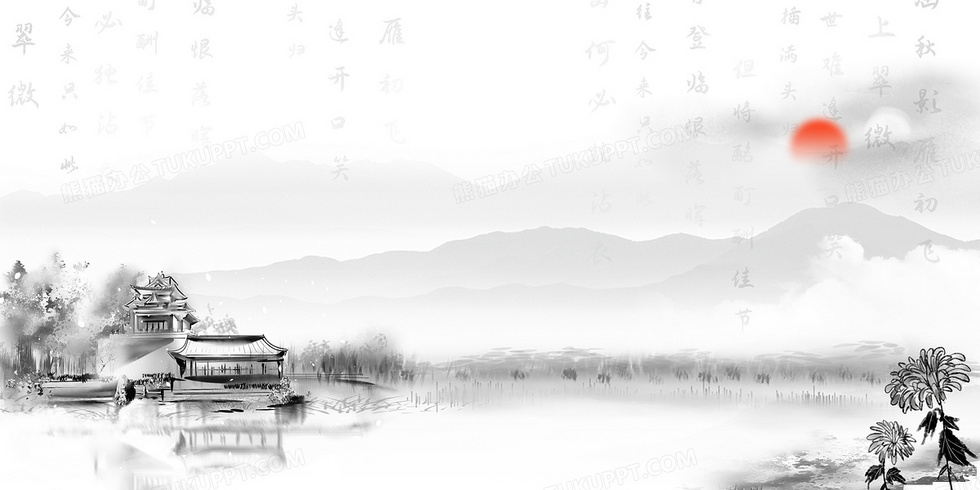 本作品内容为中国风意境水墨建筑重阳诗词菊花背景, 格式为 psd, 大小36 MB, 图片尺寸为4724 x 2362, 作品中背景图片无需修改, 源文件无水印,可以直接使用, 欢迎使用熊猫办公。 如认为平台内容涉嫌侵权,可通过邮件:tousu@tukuppt.com提出书面通知,我们将及时处理。