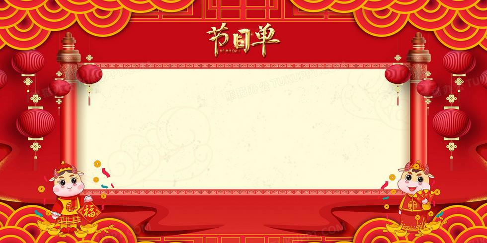 本作品内容为新年红色节目单大屏背景, 格式为 psd, 大小31 MB, 图片尺寸为4724 x 2362, 作品中背景图片无需修改, 源文件无水印,可以直接使用, 欢迎使用熊猫办公。 如认为平台内容涉嫌侵权,可通过邮件:tousu@tukuppt.com提出书面通知,我们将及时处理。