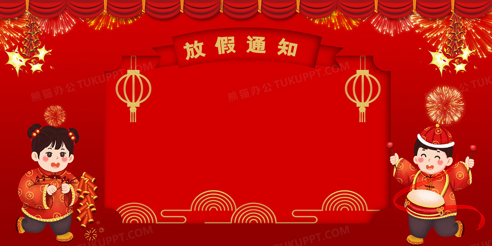本作品内容为喜庆红色中国风放假通知背景设计, 格式为 psd, 大小19 MB, 图片尺寸为4724 x 2362, 作品中背景图片无需修改, 源文件无水印,可以直接使用, 欢迎使用熊猫办公。 如认为平台内容涉嫌侵权,可通过邮件:tousu@tukuppt.com提出书面通知,我们将及时处理。