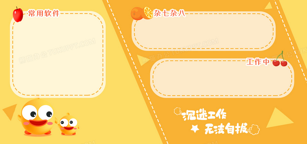 本作品内容为小黄鸭办公软件电脑桌面分类卡通背景, 格式为 psd, 大小1 MB, 图片尺寸为1920 x 900, 作品中背景图片无需修改, 源文件无水印,可以直接使用, 欢迎使用熊猫办公。 如认为平台内容涉嫌侵权,可通过邮件:tousu@tukuppt.com提出书面通知,我们将及时处理。