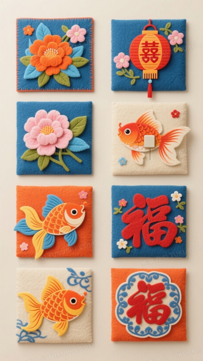 本作品内容为AI图片提示词创作一组九张的方形布艺装饰图案, 格式为 jpg, 大小1 MB, 图片尺寸为936 x 1664, 源文件无水印, 欢迎使用熊猫办公。 如认为平台内容涉嫌侵权,可通过邮件:tousu@tukuppt.com提出书面通知,我们将及时处理。