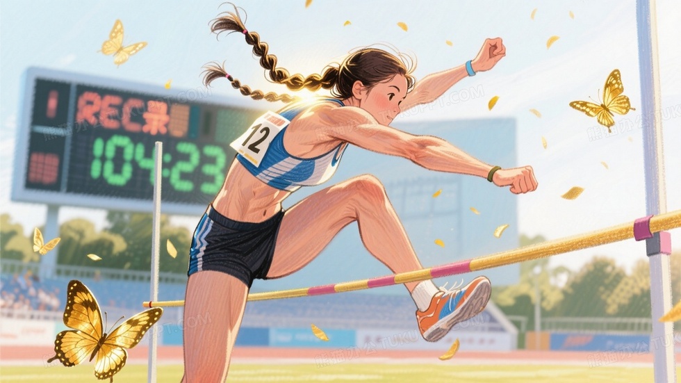 彩铅质感跳高夺冠插画