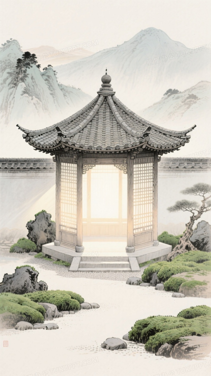 本作品内容为禅意庭院建筑组合插画, 格式为 jpg, 大小1 MB, 图片尺寸为936 x 1664, 源文件无水印, 欢迎使用熊猫办公。 如认为平台内容涉嫌侵权,可通过邮件:tousu@tukuppt.com提出书面通知,我们将及时处理。