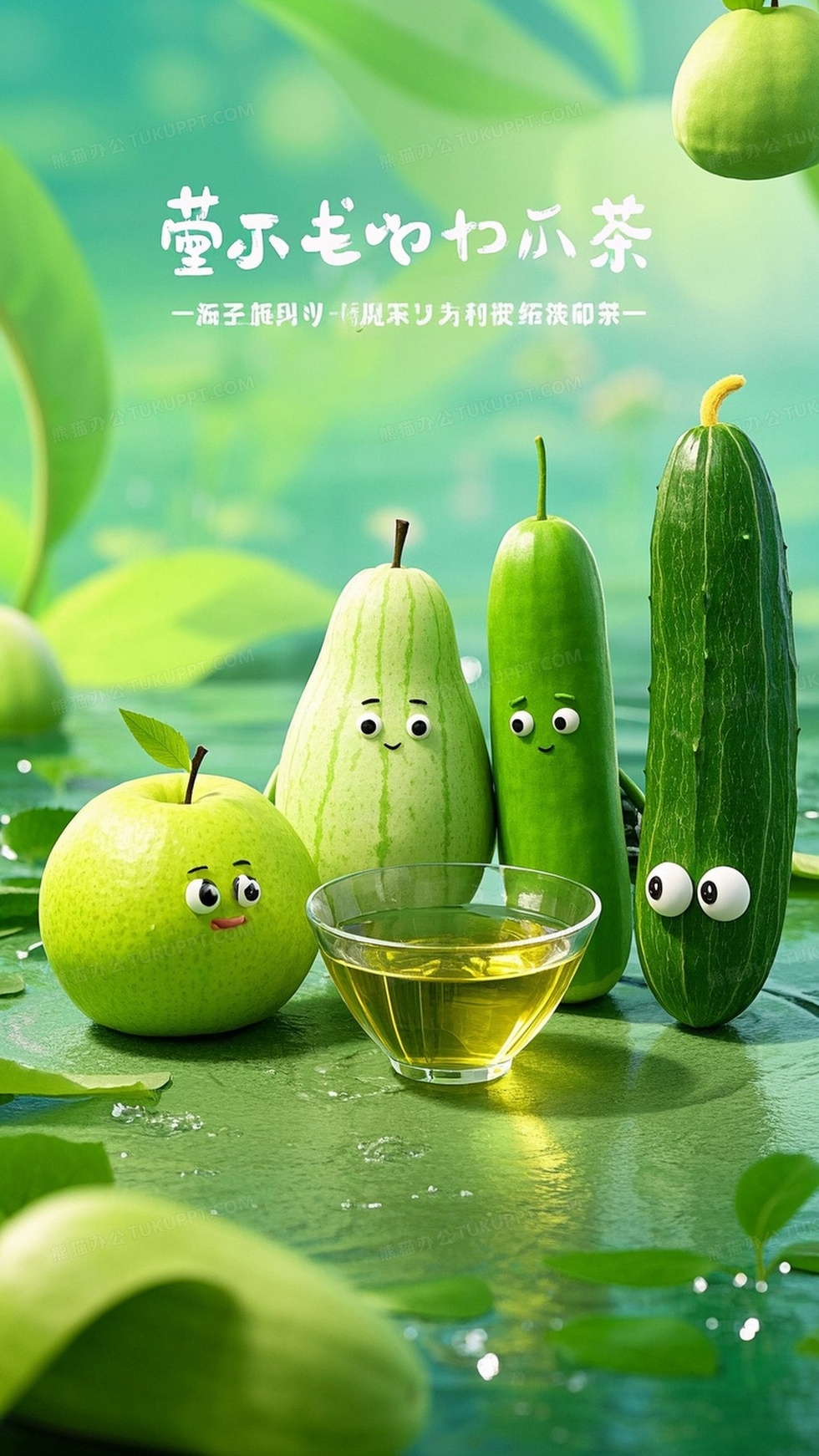 本作品内容为雪梨冬瓜黄瓜绿茶四个拟人化, 格式为 jpg, 大小2 MB, 图片尺寸为2304 x 4096, 源文件无水印, 欢迎使用熊猫办公。 如认为平台内容涉嫌侵权,可通过邮件:tousu@tukuppt.com提出书面通知,我们将及时处理。