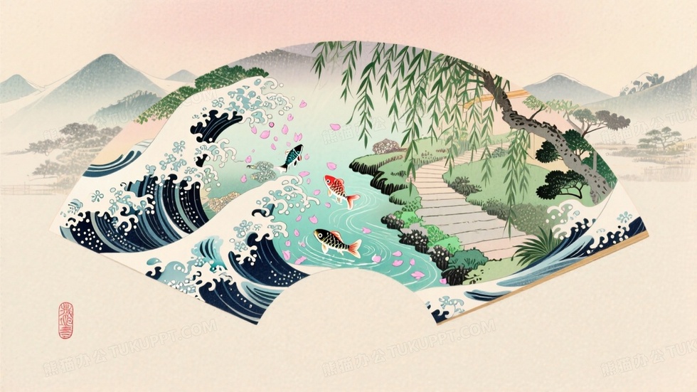本作品内容为浮世绘风格江南夏景扇形构图容纳曲径通幽的园林, 格式为 jpg, 大小1 MB, 图片尺寸为1664 x 936, 源文件无水印, 欢迎使用熊猫办公。 如认为平台内容涉嫌侵权,可通过邮件:tousu@tukuppt.com提出书面通知,我们将及时处理。
