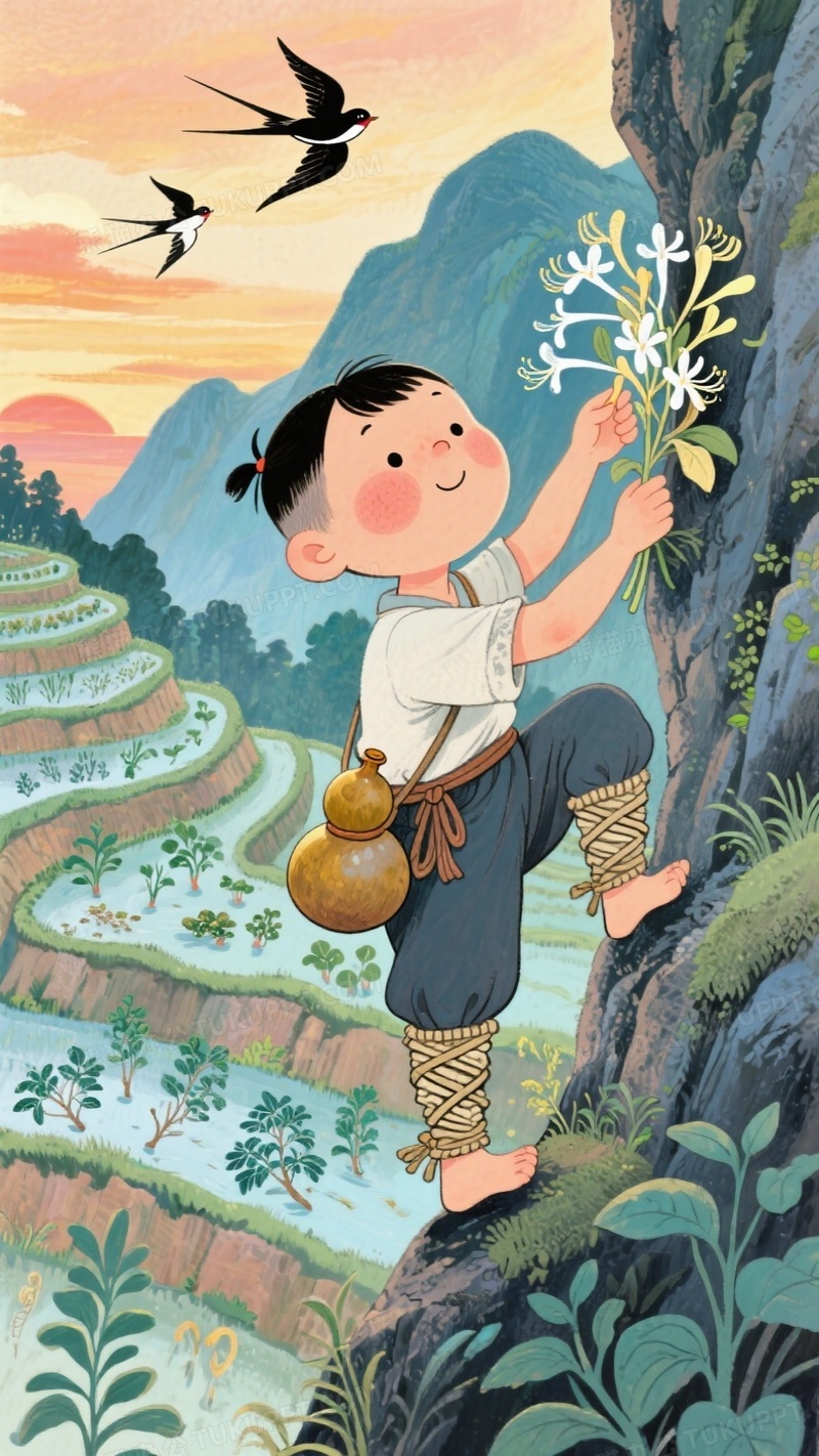 本作品内容为绘本风山间采药图圆脸童子踮脚摘崖壁金银花, 格式为 jpg, 大小1 MB, 图片尺寸为936 x 1664, 源文件无水印, 欢迎使用熊猫办公。 如认为平台内容涉嫌侵权,可通过邮件:tousu@tukuppt.com提出书面通知,我们将及时处理。