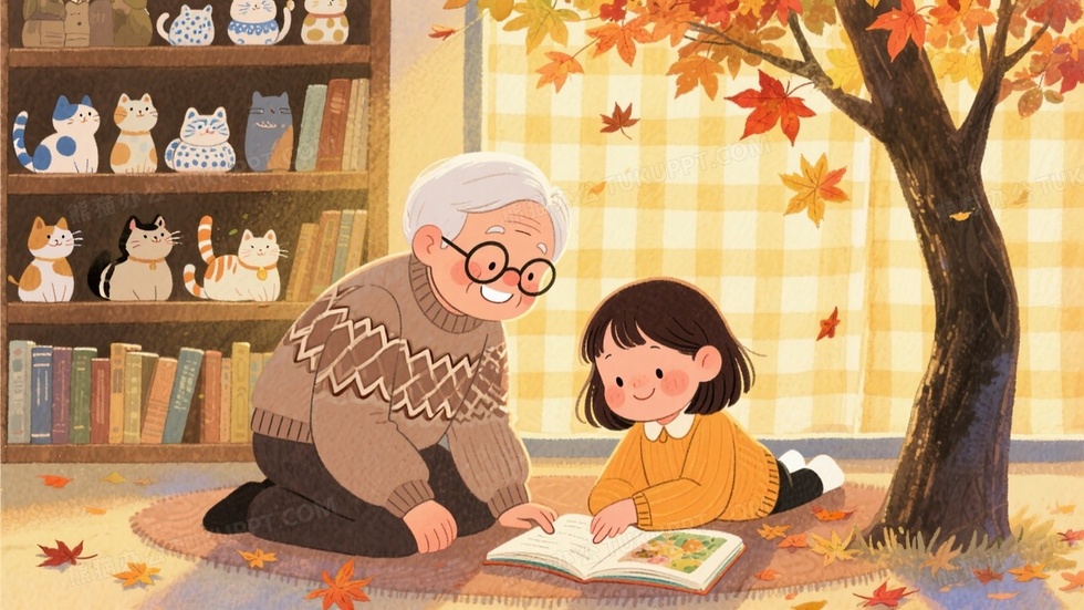 卡通插画描绘白发老人与孙女在枫树下读绘本
